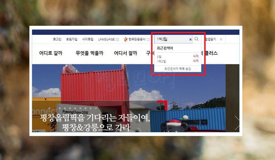 제가 국내 관광지를 찾는 방식대로 알려드리겠습니다. 홈페이지에 접속하면 돋보기 버튼을 누를 후 1박2일을 입력해주세요.