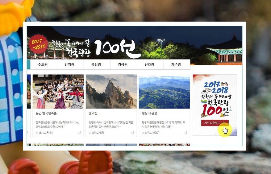 상세한 후기나 코스는 필요없고, 1박2일 동안 가볼만한 국내여행지를 알고 싶은 경우에는 한국관광지 100선 지도를 이용하면 좋습니다. 홈페이지 오른쪽에 다운로드 버튼이 있어요.