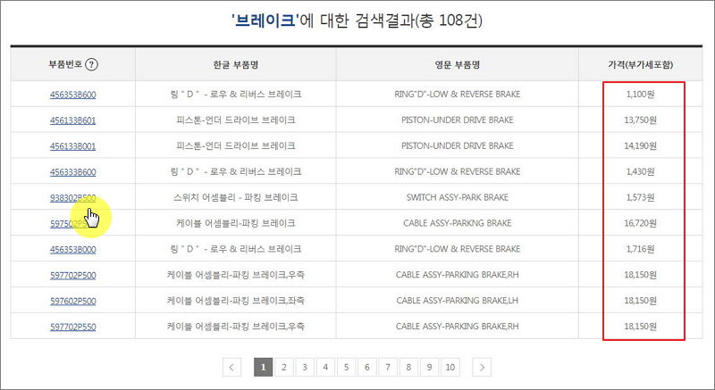 ▼ 저는 쏘렌토에 들어가는 브레이크 관련 부품을 검색했습니다. 총 108건의 리스트가 나타났습니다. 여기에서 판매처에 대해 알아보고 싶다면 기아자동차 순정부품 가격 리스트 좌측에 있는 번호를 클릭합니다.