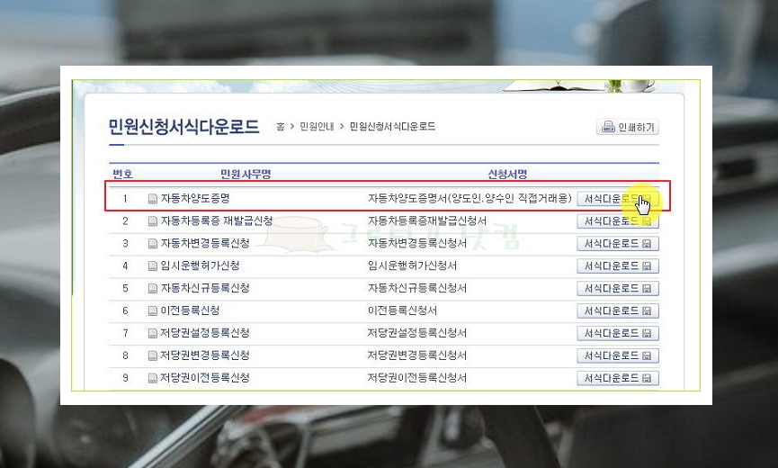 민원안내로 들어가서 민원신청서 서식 다운로드를 클릭해주세요. 자동차매매계약서 양식 무료 제공은 물론이고, 등록증 재발급신청서나 신규등록신청서 등의 양식을 무료로 내려받을 수 있습니다.