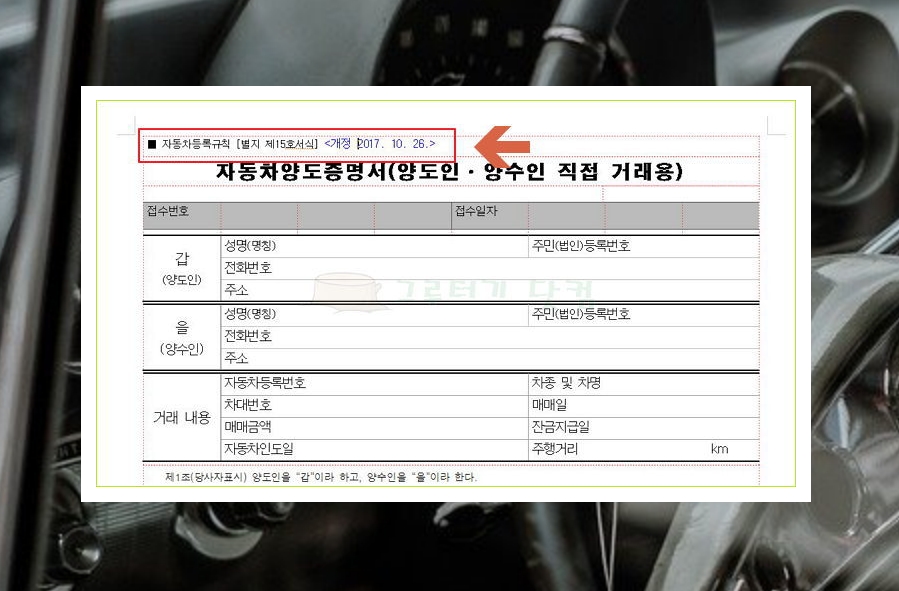 오랜만에 자동차 민원포털에 가보니 자동차양도증명서가 최신본으로 개정되었다는 것을 알았습니다. 매매계약서 맨 위를 보시면 날짜가 표기되어 있는데요. 무료 양식을 첨부했으니 쉽게 다운 받으시길 바랍니다.