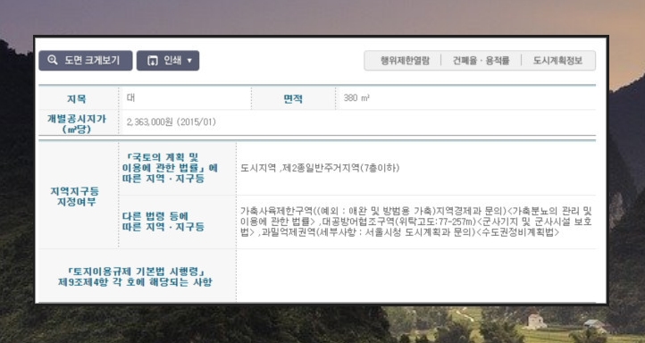 하지만 모든 투자는 위험이 뒤따릅니다. 그러므로 땅에 대한 투자를 하시기에 앞서 꼭 조회하셔야 될 것이 있는데요. 바로 토지이용계획확인원을 열람해 보는 것입니다. 해당 문서는 인터넷을 활용하시면 무료열람하실수 있습니다. (발급은 수수료가 발생하오니 이점 참고하세요~)