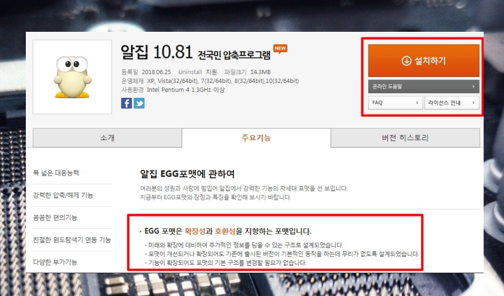 ▲ 알집 사이트에 접속하면 "설치하기" 버튼을 눌러주세요.