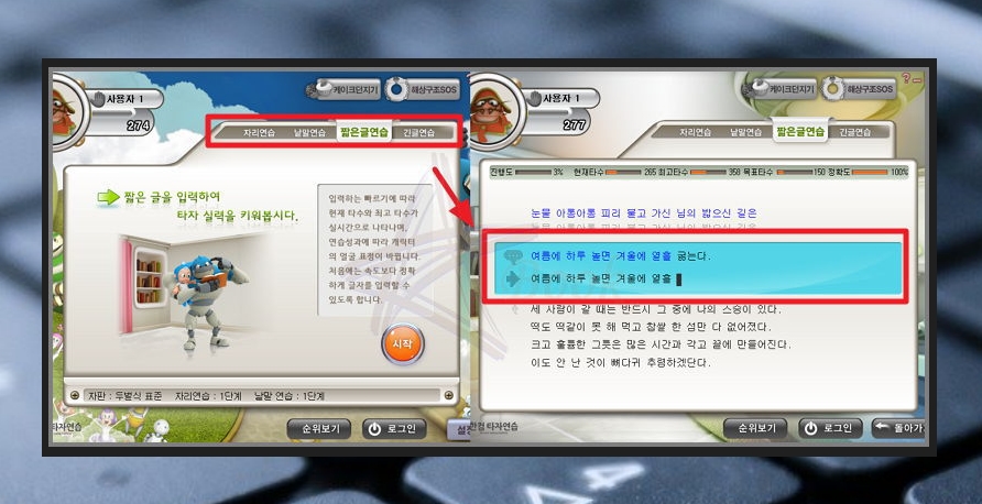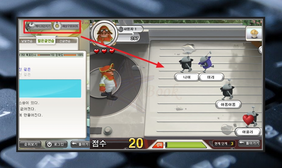 오른쪽 위에 케이크던지기와 해상구조SOS 메뉴가 보이시나요? 타자연습 프로그램인데요. 따로 다운로드하기를 하지 않아도 바로 게임을 진행할 수 있습니다.