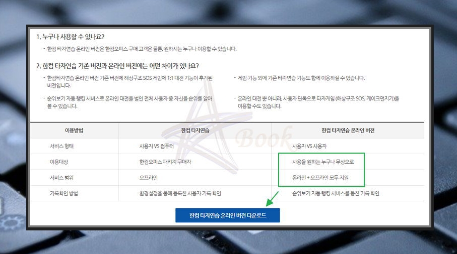 사이트에서 말하는 바와 같이 해당 프로그램은 온라인과 오프라인을 모두 지원하고, 누구나 무상으로 이용하실 수 있습니다. 서비스 형태에서 사용자 vs 사용자라고 되어 있지만, 혼자 연습하기와 컴퓨터 게임하기 모두 가능합니다. 아래에 있는 타자연습 다운로드하기 버튼을 클릭해주세요.