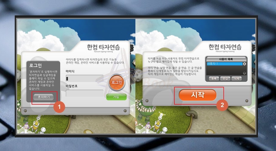 한컴 타자연습을 실행한 후 '혼자하기'와 '시작' 버튼을 클릭해주세요. 온라인 서비스를 사용하지 않아도 다양한 연습할 수 있습니다.
