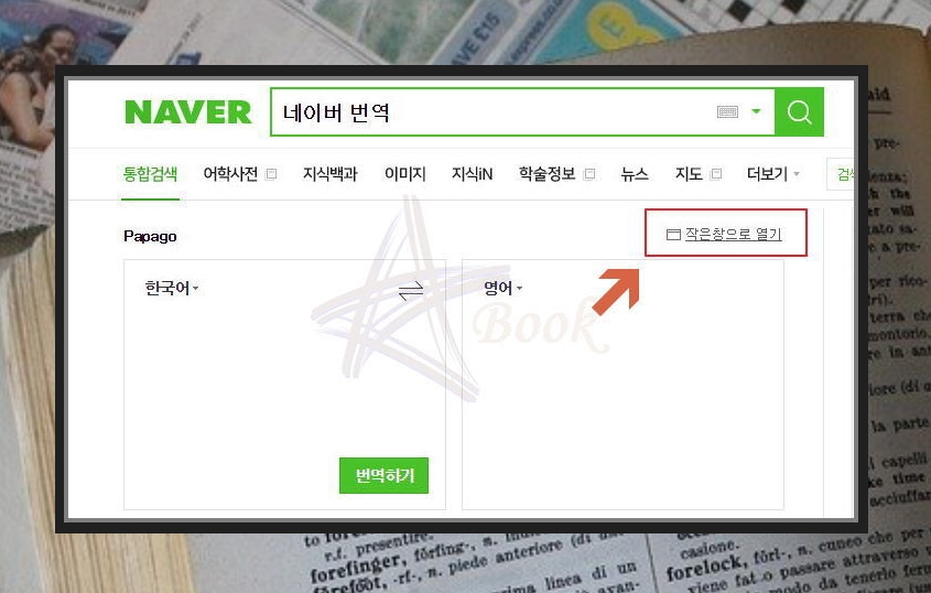▲ 일단 네이버의 영작기 프로그램을 이용하려면 '네이버 번역'이라고 검색해야 합니다. 기본 기능은 여기서 바로 할 수 있지만, 고급 기능을 활용하기 위하여 '작은창으로 열기'를 클릭해주세요.