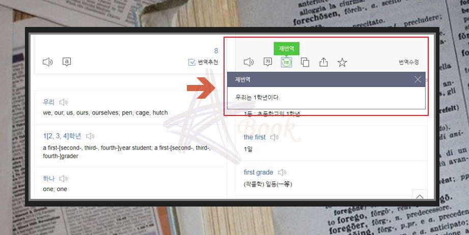 ▲ 네이버의 재번역 기능을 이용해보세요. 한글에서 영어로 번역한 결과를 다시 한글로 바꿀 수 있습니다. RE 버튼을 클릭하면 확인할 수 있어요. 부자연스러운 문장을 매끄럽게 하고 싶을 때 쓰면 좋겠죠?