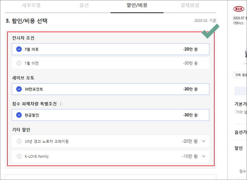 이용할 수 있는 판매조건을 선택합니다. 전시차를 구매하거나 침수 피해차량 특별조건 등을 이용하면 기존 가격보다 저렴하게 suv차량을 구매할 수 있습니다.