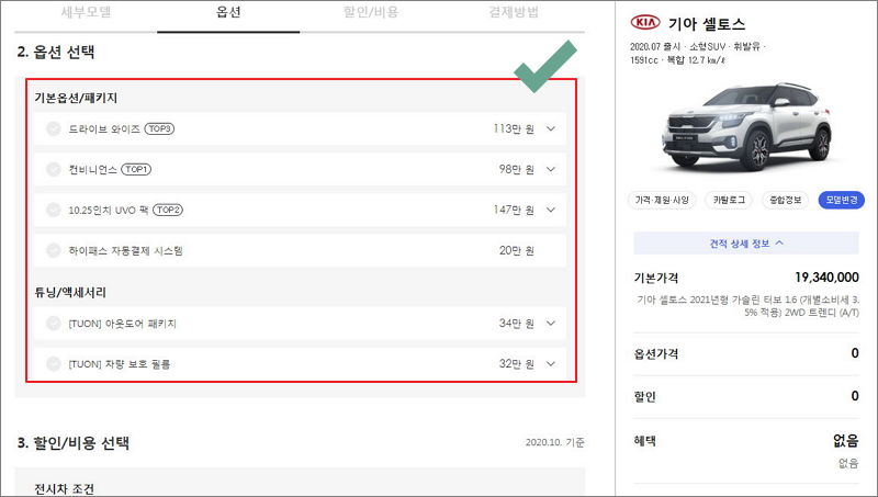 모델 이름을 클릭하면 구체적인 견적을 받는 것도 가능합니다. 견적을 받으려면 몇 가지를 선택해야 합니다. 일단 세부모델과 옵션을 선택합니다.