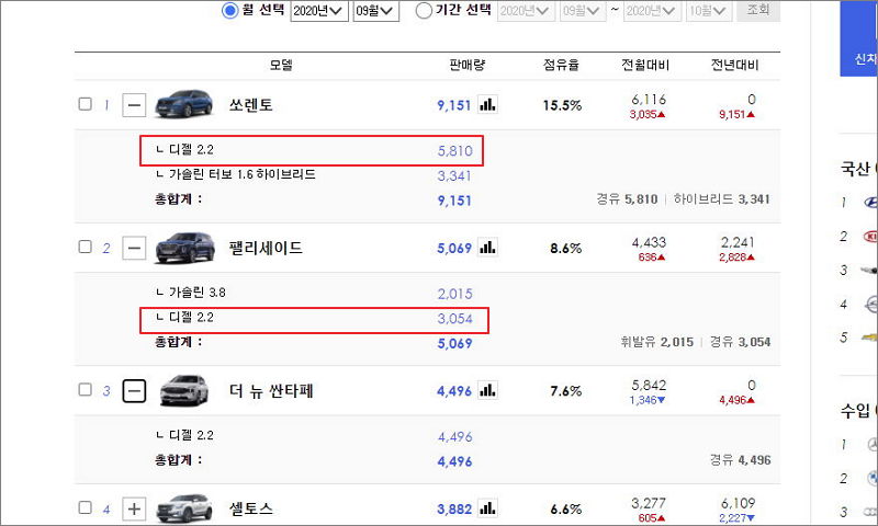 suv차량의 경우 같은 모델이라도 세부 등급에 따라 경유가 들어가는 것과 휘발유가 들어가는 것이 있습니다. 쏘렌토의 경우 경유가 들어가는 디젤 2.2에 대한 인기가 높습니다. 하이브리드의 경우 연비가 좋지만, 그만큼 자동차 가격이 높기 때문에 상대적으로 경유 차량에 비해 판매량이 낮습니다 . 펠리세이드의 경우에도 가솔린 3.8보다 디젤 2.2의 판매량이 1.5배 정도 높은 것을 확인할 수 있습니다.