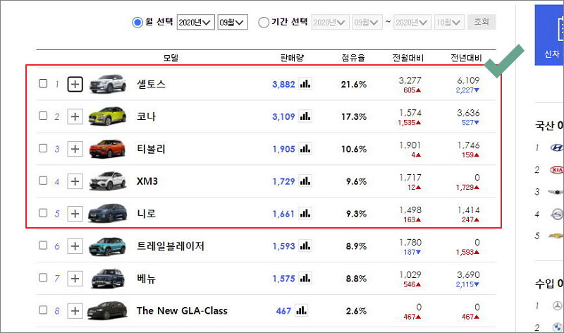 최근 젊은 사람들에게 인기가 좋은 소형suv 차량에 대한 인기순위를 살펴보겠습니다. 여기서는 최근 모델이라고 할 수 있는 셀토스의 인기가 높다는 것을 알 수 있습니다.