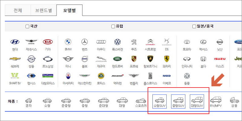 여기서 다루는 차량은 국산차는 물론이고, 유럽이나 일본, 중국 등에서 제조한 수입차도 포함하여 인기순위를 살펴볼 수 있습니다. 이번 시간에는 suv차량에 한정하여 알아볼 것이기 때문에 차종에서 소형, 중형, 대형 suv를 선택했습니다.