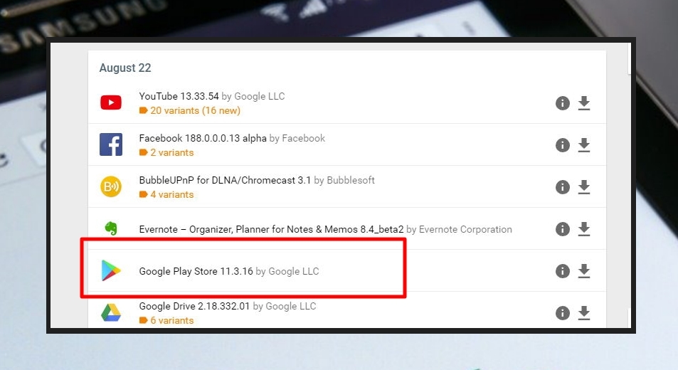 홈페이지에 접속하면 메인 화면에서 최신 버전의 어플을 만나볼 수 있습니다. 우리가 찾고 있는 Google Play Store도 있는데요. 이름 우측에 있는 다운로드 표시를 클릭해주세요.