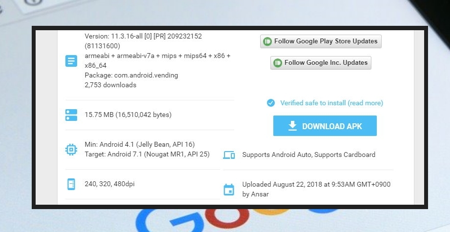 구글 플레이스토어를 포함한 여러 앱 파일을 다운 받을 수 있는 사이트가 있습니다. 바로 apkmirror 인데요. 같은 어플에 대해 여러 버전의 설치 파일을 제공하고 있기 때문에 사용하고 있는 기기에 알맞은 APK 를 구하기 좋습니다. 일부 기종의 경우 동일한 어플이라도 버전에 따라 실행이 되기도 하고, 되지 않기도 하는 현상이 있거든요.