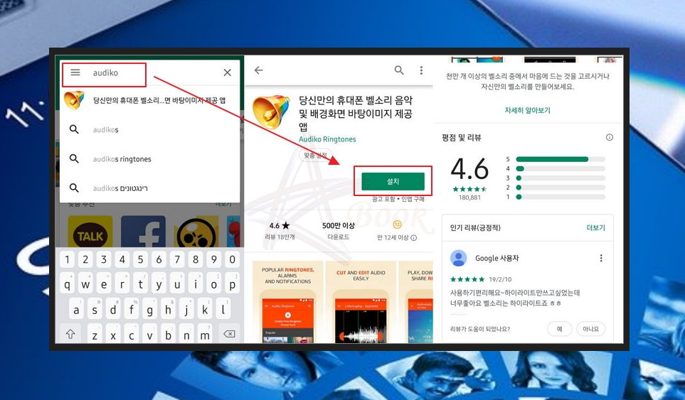 일단 어플을 하나 설치해야 돼요. audiko 라는 어플인데요. 구글 플레이 스토어에서 검색하면 바로 찾을 수 있어요. 전화 벨소리 음원은 물론이고, 배경화면으로 사용할 수 있는 이미지 다운받기에도 좋아요.