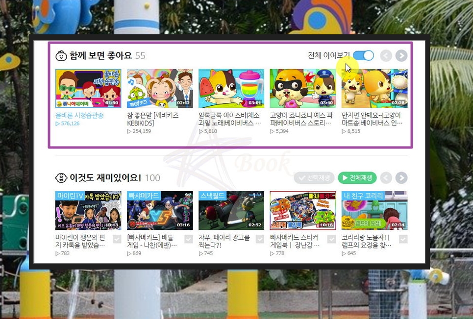좋아하는 곡을 들은 후에는 다른 곡을 추천 받을 수 있어요. 함께 보면 좋은 동요를 가지고 연속듣기 하고 싶다면 [전체 이어보기] 부분을 체크하시면 돼요.