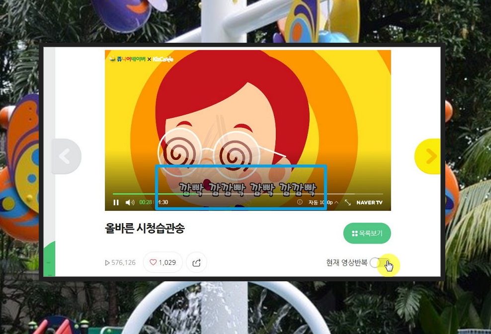 아이가 쥬니버 사이트에서 처음 무료동요를 시청하는 경우라면 '올바른 시청습관송'을 보여 주세요. 아무리 좋은 컨텐츠라고 하여도 적당히 보는 것이 좋으니까요. 어린이의 경우 자기 스스로 절제하기 어려우니 이런 컨텐츠를 통해서라도 교육이 필요해요.