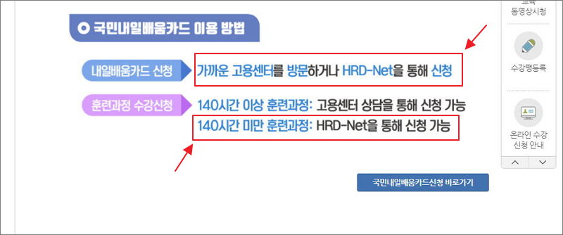 ▼ 국민 내일배움카드 신청을 하는 방법은 간단합니다. 가까운 고용센터를 방문하거나 고용노동부에서 운영하는 HRD-NET을 통해 신청하면 됩니다. 컴퓨터에 능숙한 분이라면 온라인으로 신청하는 것이 낫고, 그렇지 않은 경우라면 고용센터를 방문하는 것이 낫습니다. 내일배움카드를 이용한 훈련과정에 대한 수강신청을 하는 경우에도 2가지 방법이 있습니다. 훈련 기간이 140시간 이상이라면 고용센터 상담을 통해 신청이 가능하고, 140시간 미만인 훈련과정인 경우에는 HRD-NET 사이트를 통해 신청이 가능합니다.