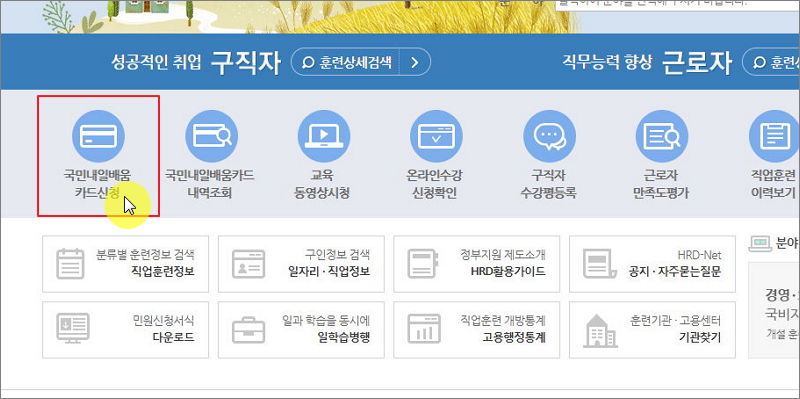 ▼ 사이트에 접속하면 메인화면 좌측 중앙에 국민 내일배움카드 신청 버튼이 있습니다. 해당 버튼을 누른 후 안내에 따라 진행하면 됩니다.