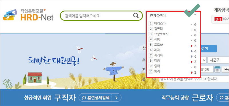 ▼ 훈련기관을 찾고자 한다면 검색을 통해 쉽게 찾을 수 있습니다. 인기 검색어를 보면 고용노동부 내일배움카드를 이용하여 어떤 훈련을 많이 받는지 알 수 있습니다. 금일 기준으로는 바리스타, 컴퓨터, 요양보호사, 제빵, 포토샵이 1위에서 5위를 차지하고 있습니다.