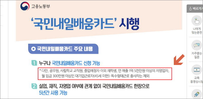 ▼ 우선 국민 내일배움카드에 대하여 주요한 부분만 살펴보도록 하겠습니다. 누구나 신청할 수 있는 카드라고 되어 있지만, 공무원, 사립학교 교직원, 졸업예정자 이외 재학생, 일정 매출 이상의 자영업자 등은 신청이 불가합니다. 자신이 여기에 해당되는지 꼭 확인하시길 바랍니다. 신청 조건에 부합이 된다면 자영업, 재직, 실업 여부 관계 없이 고용노동부에서 발급 받는 내일배움카드 한장으로 5년간 사용이 가능합니다.