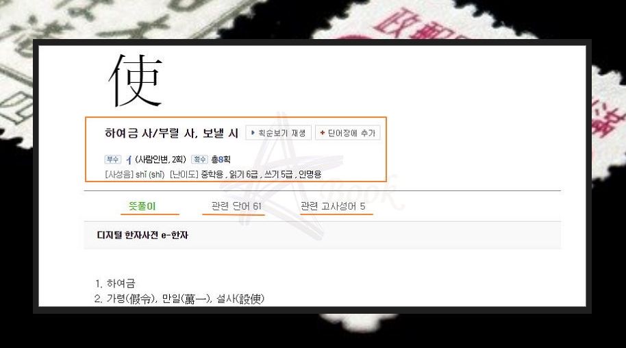 해당 한자가 어떻게 생성되었는지 기원을 알아볼 수 있습니다. '하여금 사'의 경우에는 회의문자로 보는 견해도 있다고 하네요.