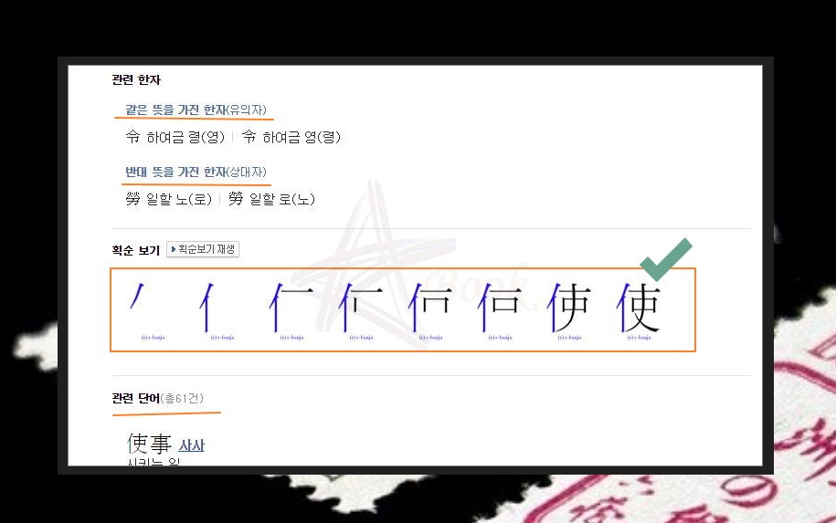 한문을 직접 쓸 때에는 획순을 알아야 해요. 획순보기 재생 버튼을 누르면 획순에 따라 그리는 법을 알려줘요. 관련 단어도 있으니 한문 공부를 하신다면 함께 보시길 바랍니다.
