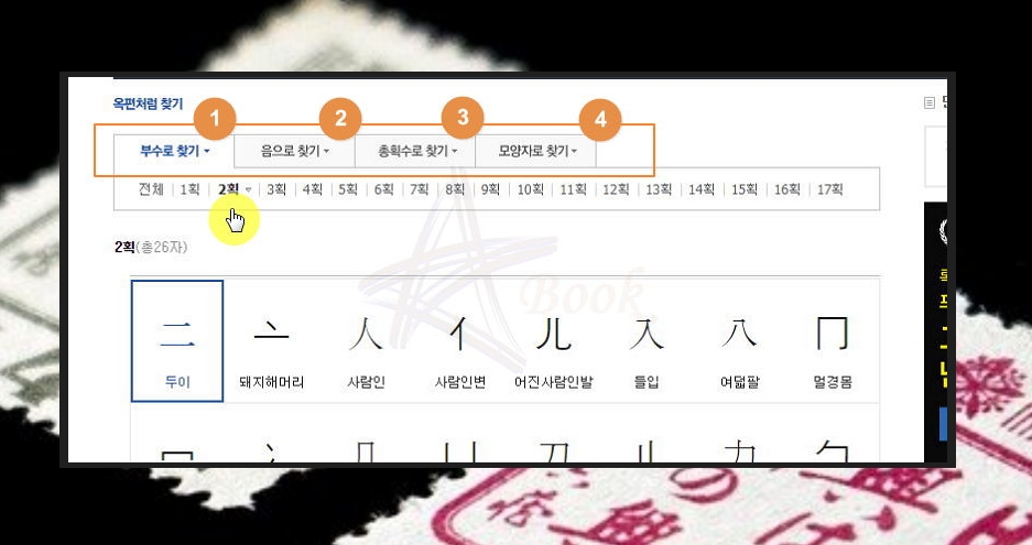 제가 가장 많이 사용하는 것은 부수로 찾기 기능입니다. 옥편을 이용할 때랑 똑같이 할 수 있어요. 일단 부수의 획수를 선택해 주세요. '사람 인'의 경우에는 2획으로 되어 있는데요. '사람 인'을 클릭하면 부수로 '사람 인'을 갖고 있는 한자가 나타납니다.