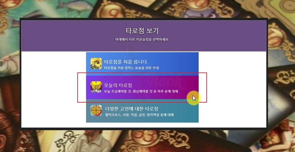 처음 이곳을 이용하는 분이라면 [타로점을 처음 접하는 분들을 위한 안내]를 클릭한 후 설명을 들어보세요. 해당 역술에 대한 신빙성이나 보는법에 대해 알아볼 수 있어요. 오늘 조심해야할 것, 명심해야 할 것 등 오늘 하루의 운에 대해 알아보고 싶으면 [오늘의 타로점]을 클릭해 주세요. 고민이 있다면 [다양한 고민에 대한 타로점]을 이용하면 돼요. 모두 무료 서비스이오니 부담이 없어요.