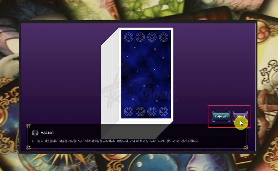카드를 한 번 섞은 후에 결정을 해야 해요. 다시 섞을 지 바로 시작할지 말이에요. 마음이 가는 데로 선택하면 되는데요. 1회 또는 2회 정도 더 섞을 수 있어요.
