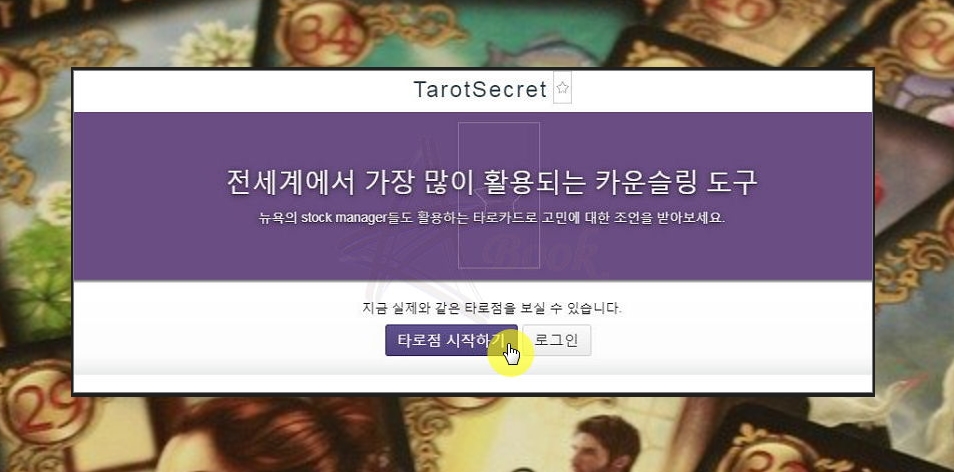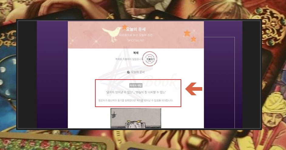 최근에 알게 된 곳인데요. 다른 곳에 비해 해석이 풍부해요. 검색 사이트에서 'tarotcafe'라고 검색하면 찾을 수 있어요. 타로시크릿이라는 곳인데요. 회원가입을 하지 않아도 1회는 무료로 볼 수 있어요.