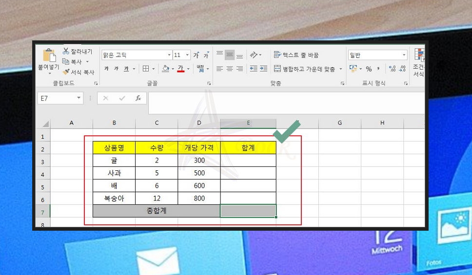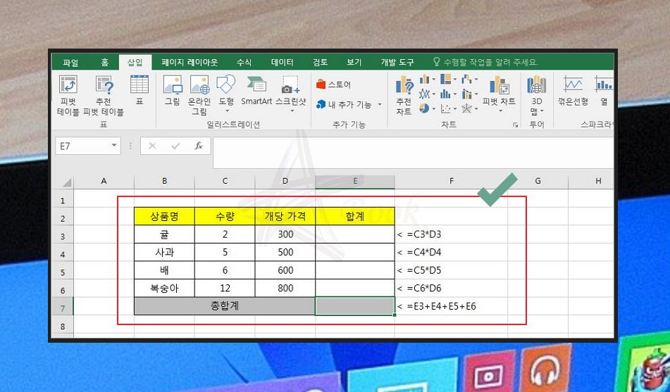 앞서 설명 드린 바와 같이 각 과일에 대하여 구매 비용을 계산하고, 그 값을 모두 더하여 [총합계]를 산출할 수 있습니다. 엑셀에서 수량에 적혀 있는 셀의 위치와 개당 가격이 적혀 있는 셀의 위치를 곱하기만 하면 돼요. 총합계는 합계가 들어있는 셀을 모두 더하면 되고요.