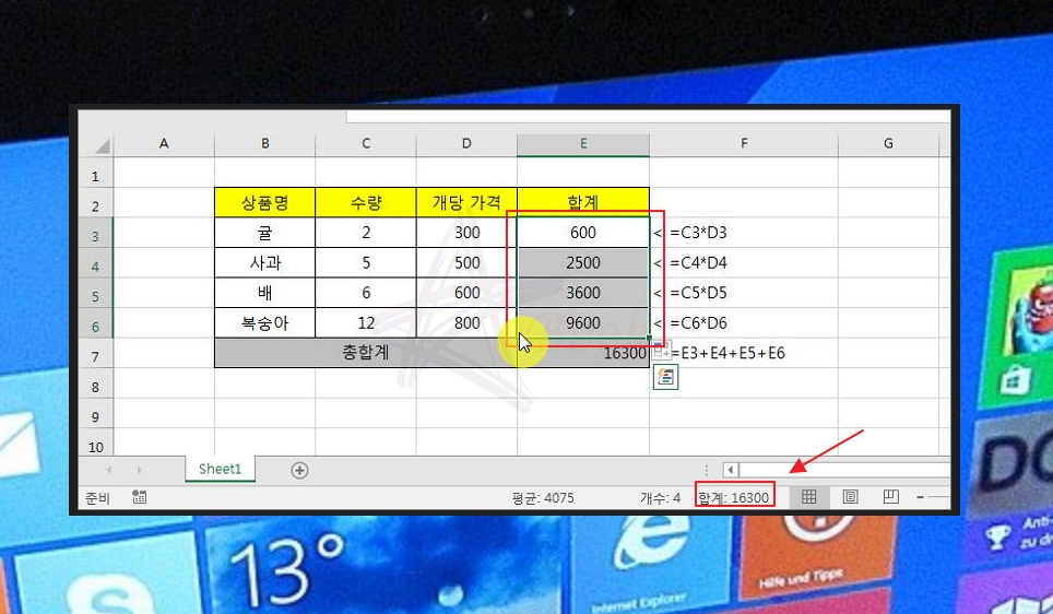총합계 옆에 있는 셀에 결과값이 입력되었습니다. sumproduct 함수를 사용하여 얻은 결과인데요. 해당 값이 정말로 맞는지 확인해 보겠습니다. 각 과일의 합계를 더한 후 드래드를 해보았어요. 엑셀 하단에 있는 작업표시줄을 보면 드래그한 셀의 합계를 확인할 수 있습니다. 16,300원이 나타났네요. 이렇게 sumproduct 함수를 제대로 사용했음을 확인할 수 있습니다.