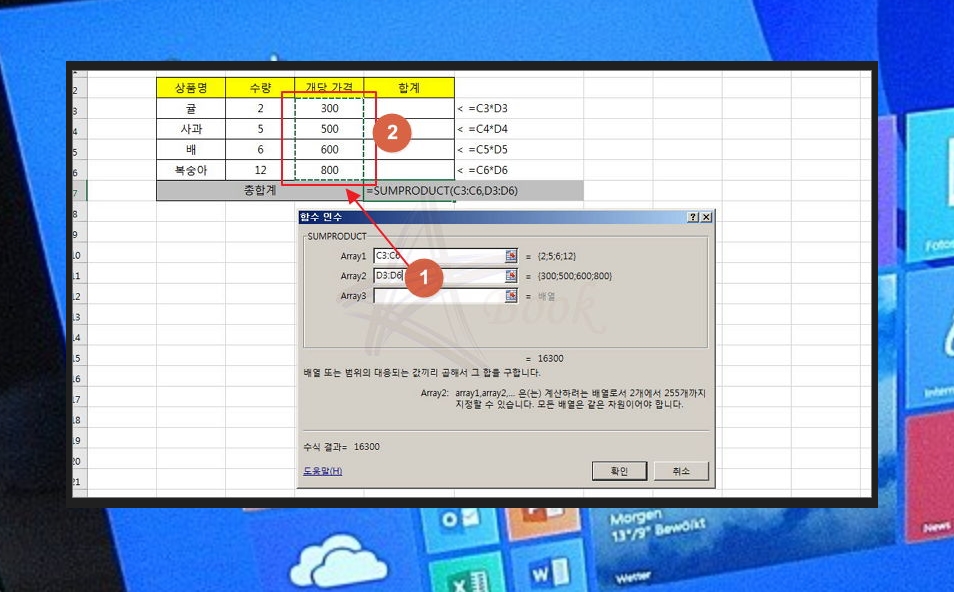 sumproduct 함수의 인수에는 Array1, Array2, Array3가 있는데요. 엑셀에서 각 배열에 있는 값을 서로 곱한다고 생각하시면 됩니다. Array1에는 수량이 적혀 있는 배열(셀 범위)의 위치를 넣어 주세요. Array2에는 개당 가격이 적혀 있는 배열(셀 범위)의 위치를 입력하면 됩니다. 직접 셀 주소를 타이핑 할 필요는 없고요. Array 칸에 마우스를 클릭한 후 입력하고 싶은 범위를 마우스로 클릭 및 드래그 하시면 됩니다.