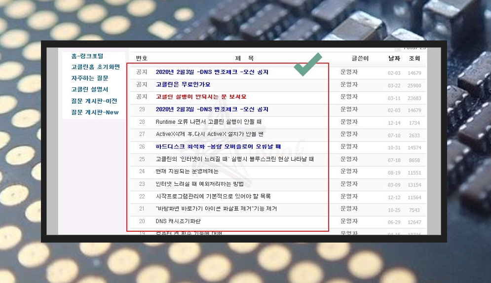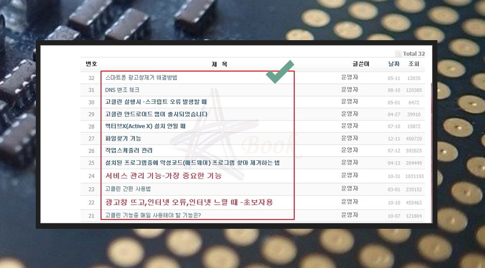 고클린을 사용하다가 문제가 있을 수도 있는데요. 그런 경우 [자주하는 질문] 게시판을 통해 쉽게 해결할 수 있어요. runstime 오류가 나거나 activex 설치가 안될 때 등 여러 상황에 대처하는 방법을 알려줘요.