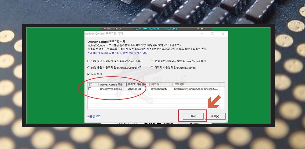고클린의 엑티브x 삭제 기능을 클릭하면 ActiveX Control 삭제 창이 열려요. 일정 기간 동안 사용되지 않은 엑티브X를 쉽게 삭제할 수 있어요.