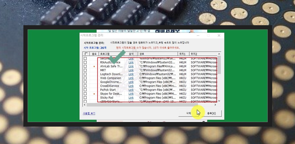 시작 프로그램이 많으면 컴퓨터가 많이 느려져요. 불필요한 소프트웨어를 필요할 때 직접 실행하는 것이 좋은데요. 본인이 확실하게 아는 프로그램 중에서 부팅할 때 자동으로 실행될 필요가 없는 것을 선택한 후 삭제해주세요. 일부 프로그램의 경우 삭제하게 되면 문제가 발생할 수 있으니 조심히 삭제해야 해요. 고클린에서 제공하는 사용법을 참고하면 도움이 될 거에요.