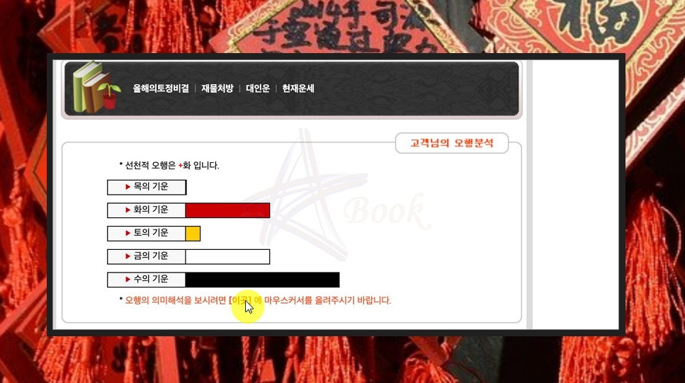 오행분석 결과가 나왔어요. 목, 화, 토, 금, 수 중에 어떤 부분이 많은지 또는 적은지 확인해 보세요. 오행의 의미해석을 상세하게 보고 싶다면 마우스 커서를 사이트에서 안내하는 버튼 위에 올려놓으면 돼요.