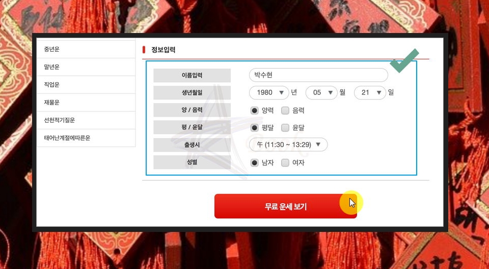 일단 간단한 정보를 입력해야 해요. 점집에서도 물어보는 사주 관련 정보에요. 보통 이름, 태어난 날짜, 성별, 태어났을 때의 시각으로 구성되어 있는데요. 모두 입력한 후 '무료 운세 보기' 버튼을 클릭하면 토정비결 해석을 만나볼 수 있어요.