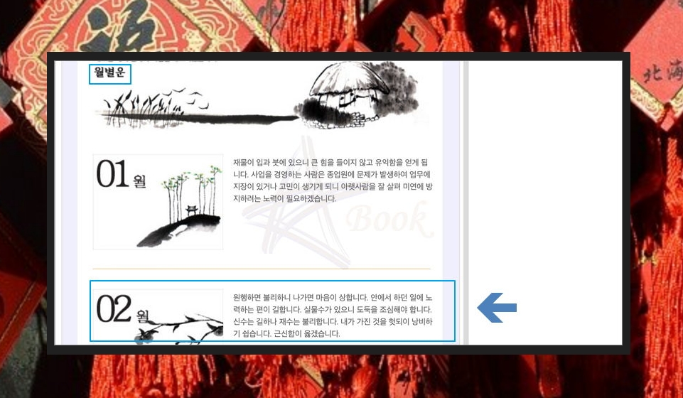 2024년 한 해에 대한 총운을 살펴보았는데요. 매월마다 어떤 일이 생길지 알아보는 월별운도 확인이 가능해요. 2024년 1월은 지나갔고, 토정비결을 통해 2월부터 보면 돼요. 좀 더 상세하게 올해 운을 살펴보고 싶을 때 이용하면 좋아요.
