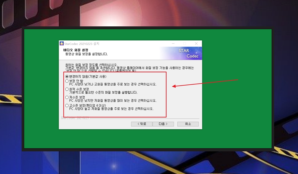 현재 통합코덱을 설치하려고 하는 컴퓨터 사양에 맞는 비디오 화질을 선택해 주세요. 저화질 동영상을 자주 보는 경우 보정을 해주는 것이 나을 거에요.