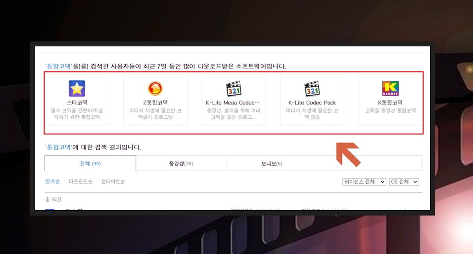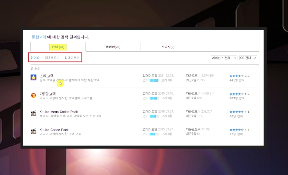 네이버 소프트웨어 홈페이지에서 "통합코덱"을 검색해 보세요. 그럼 관련 소프트웨어가 34개나 검색이 되는데요. 여기에서 인기가 높거나 다운로드 횟수가 많은 것을 선택하면 돼요. 대부분 무료 설치 및 사용이 가능해요.