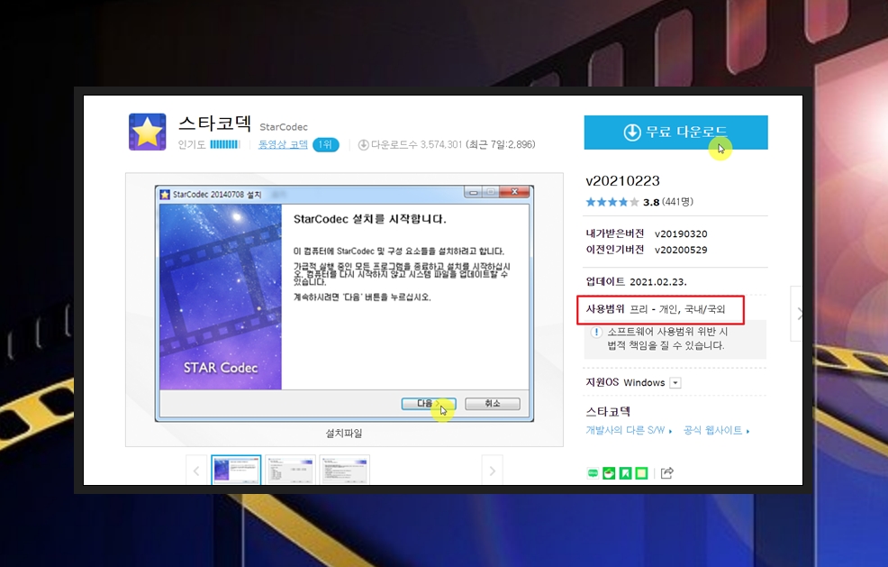 저는 동영상 통합코덱 분야에서 1위를 차지하고 있는 스타코덱을 선택했어요. 사용범위를 보면 무료가 확실한데요. 사이트 화면 우측 상단에 있는 "무료 다운로드" 버튼을 클릭하면 설치 파일을 다운 받게 돼요. 다운 받으면 해당 파일을 실행해 주세요.