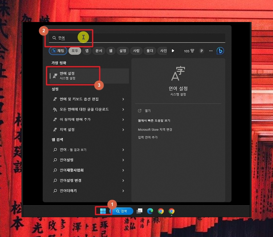 가장 먼저 윈도우 시작 버튼을 누른 후 "언어"를 입력해 보세요. 그럼 [설정] 메뉴를 찾을 수 있는데요. 해당 메슈를 실행해 줍니다. 제어판이나 시스템 설정을 통해 열어도 되지만, 시작 버튼 후 타이핑을 하여 여는 방식이 가장 편리합니다.