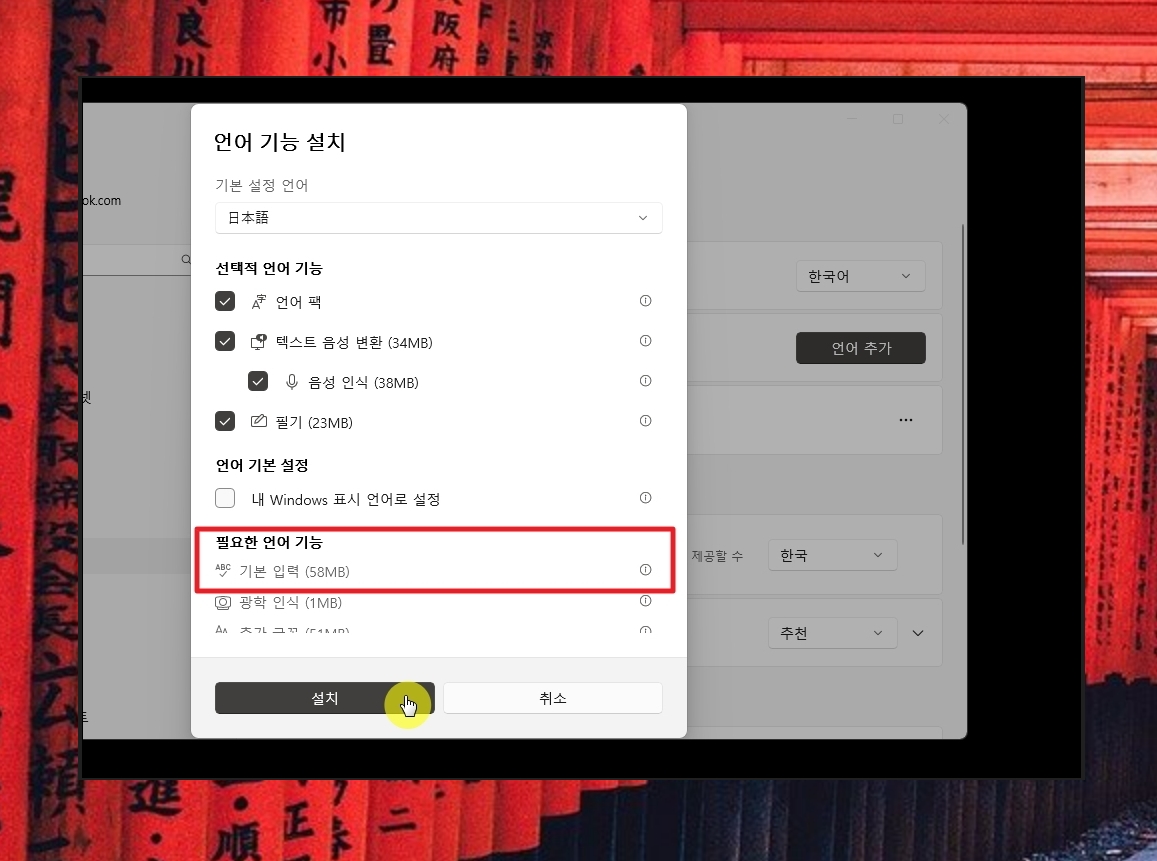 언어 기능 설치 창에서 보면 여러 가지 관련 파일을 추가할 수 있게 되어 있는데요. 필요 여부에 따라 선택하시면 됩니다. 기본적으로 기본 입력 부분은 설치해야 하는데요. 그 부분은 필수이기 때문에 체크하는 부분이 없어요. 그럼 [설치] 버튼을 눌러 해당 컴퓨터에서 일본어 자판 입력이 가능하도록 만들어 주세요.