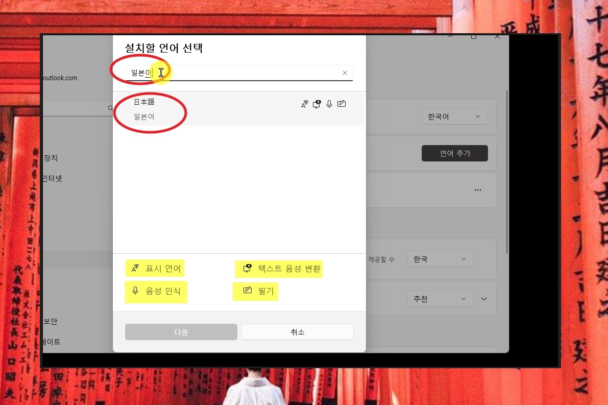 [언어 추가] 버튼을 클릭하면 설치할 언어를 선택하는 창이 열리는데요. 여기에서 "일본어"를 검색해 주세요. 그럼 표시 언어, 텍스트 음성 변환, 음성 인식, 필기 아이콘이 표시가 되어 있는 일본어팩을 찾을 수 있어요.
