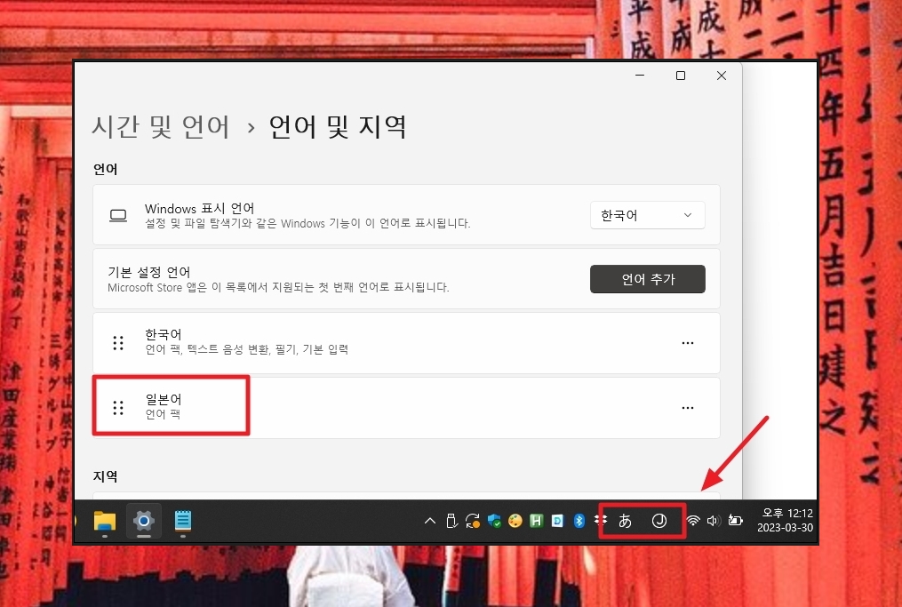 창이 열리면 "언어 및 지역" 선택 후에 언어 카테고리에 있는 기본 설정 언어에서 [추가] 버튼을 클릭해 줍니다. 다음 화면과 같이 [한국어]가 등록되어 있는 것을 볼 수 있는데요. 여기에 일본어를 등록하면 됩니다. 언어 팩, 텍스트 음성 변환, 필기, 기본 입력 컨텐츠를 추가할 수 있는데요. 여기에서 기본 입력을 추가하면 됩니다. 당연히 모두 추가해도 되고요.