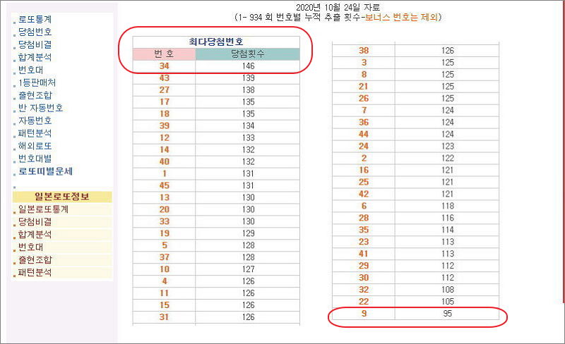 ▼ 당첨된 로또 번호의 당첨 횟수를 비교해보면 가장 많이 나온 번호가 있고, 가장 적게 나온 번호를 파악할 수 있습니다. 1회부터 934회까지 추첨한 결과를 내용으로 분석한 자료를 살펴보겠습니다. 146회나 나온 34번이 가장 많이 당첨이 되었고, 반대로 9번이 95회로 가장 적게 당첨이 되었습니다.