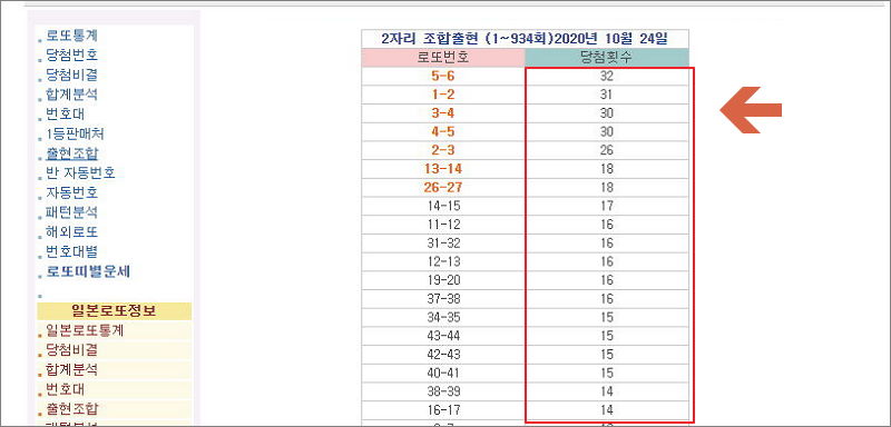 ▼ 2자리 조합출현은 연속되는 번호가 함께 당첨이 되는 경우를 분석한 것입니다. 지금까지 5번과 6번이 동시에 당첨이 되었을 때 32회로 가장 많다고 합니다. 그 다음 순서는 직접 살펴보시길 바랍니다.